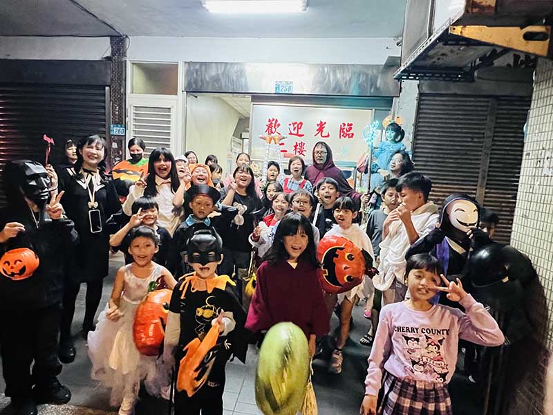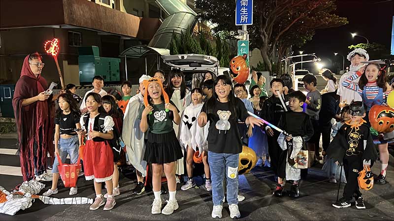 交接活動結束後,校長與會長帶領盛裝打扮的家長與孩子們,一同展開萬聖節踩街活動,多元繽紛的造型在街道間穿梭,吸引許多社區民眾關注,商家老闆也走出店外與孩子玩起互動遊戲,笑聲此起彼落,街道上洋溢著澳底師生與社區鄰居的歡樂氣息,成為今晚最美的夜景。