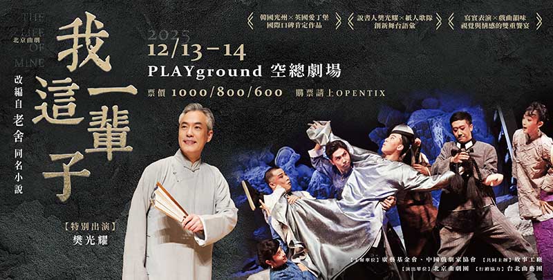廣藝基金會特邀北京曲劇《我這一輩子》來台演出 12月空總劇場登場由廣藝基金會、中國戲劇家協會,攜手故事工廠主辦,北京曲劇團國際口碑劇目《我這一輩子》將於2025年12月13日至14日於臺北PLAYground空總劇場演出。在台演出的版本,特邀樊光耀擔任劇目說書人,更為故事增添獨特魅力。