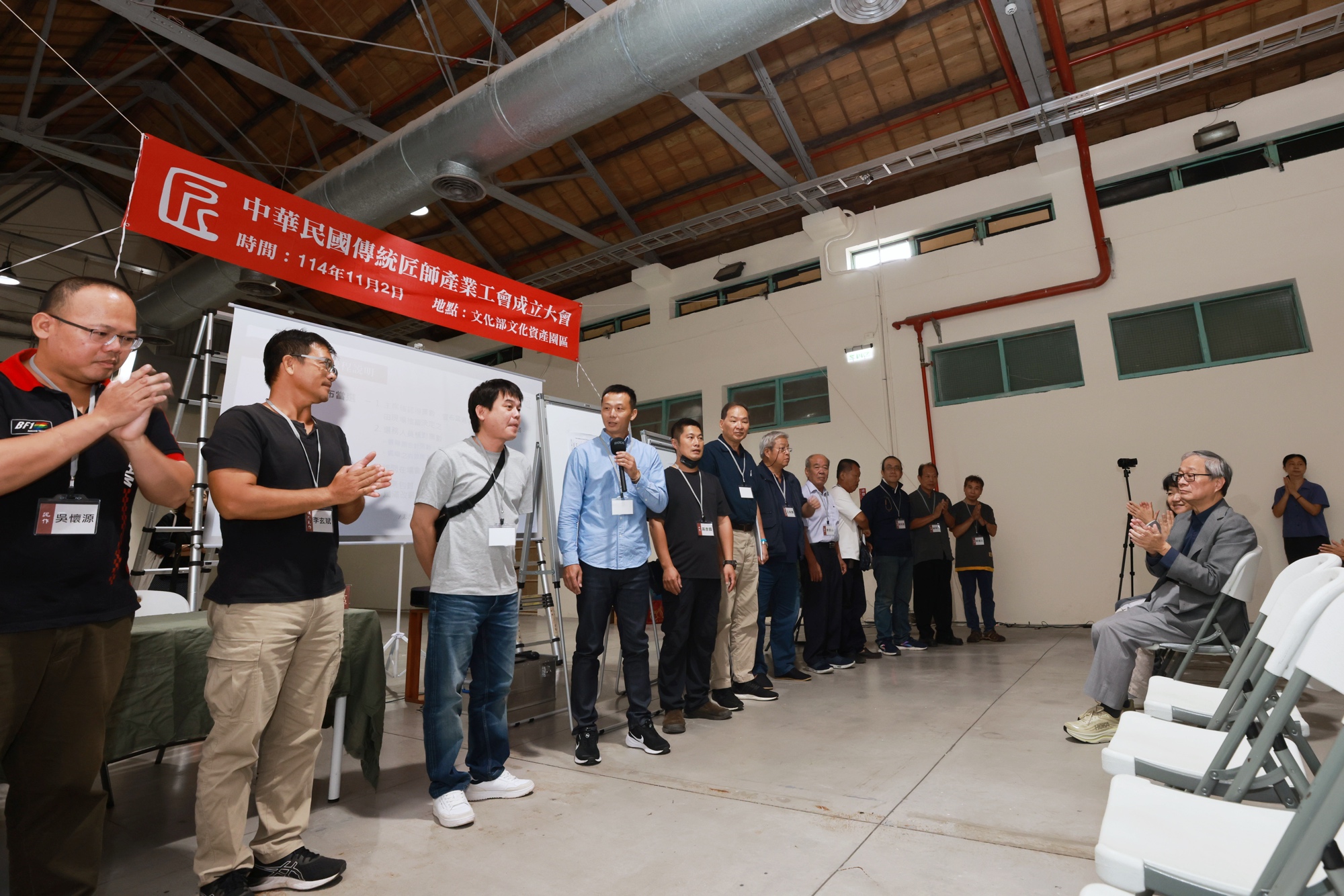 由行政院文化獎得主、客家一等文化獎章得主、文化部重要文化資產保存技術土水修造(瓦作)保存者傅明光倡議成立的「中華民國傳統匠師產業工會」,於2025年6月29日由38位各界不同工種的傳統匠師共同發起,舉行發起人會議並組成籌備會,決議由鍾心怡建築師擔任籌備會召集人;於2025年8月1日至8月31日公開徵求會員,目前共計60名會員,於今(2)日假文化部文化資產園區B03藝文展覽館B館舉行成立大會。