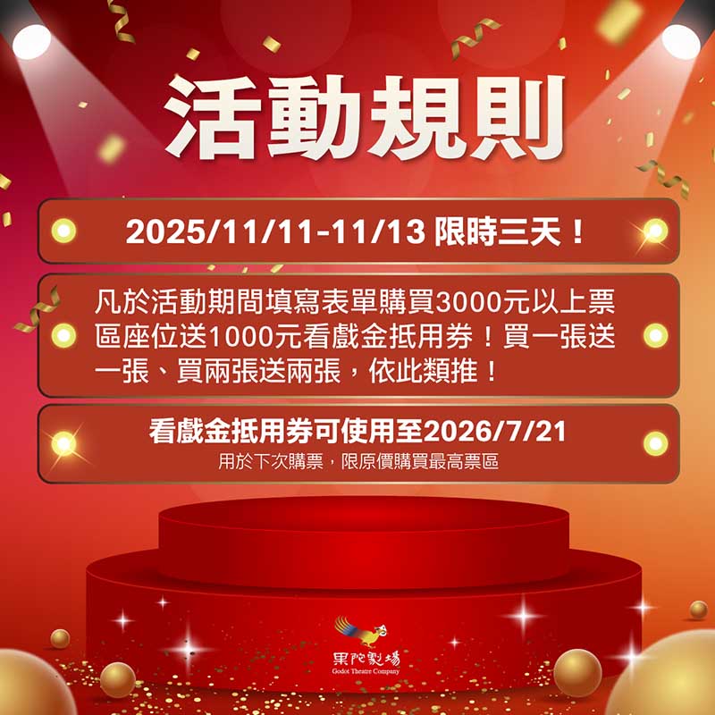 為讓藝文愛好者消費更有感,果陀劇場特別推出期間限定「千元看戲金」活動,邀請觀眾用行動支持劇場、回饋看戲樂趣。活動自2025/11/11-13限時舉行,凡於活動期間購買果陀劇場任一演出票價3000元(含)以上票券,即可獲得1000元看戲金抵用券乙張。抵用券可於下次購票時使用,使用期限至2026/7/21止。果陀劇場年底強檔不斷,人氣音樂劇《三個傻瓜》自今年五月首演佳評如潮後,為饗劇迷,將於12/5-21在苗栗、桃園、台北三地加演,現今苗北場已全數售罄,桃園及台北場票房突破九成,餘票有限,觀眾可把握最後搶票機會。另一齣深受觀眾喜愛的音樂劇《生命中最美好的5分鐘》,睽違五年後也將重磅回歸,自2026/1/31-6/14展開巡演,將於台北、嘉義、桃園與台中,再度掀起音樂劇熱潮。購票詳情請上果陀劇場官網(www.godot.org.tw)或OPENTIX購票系統(www.opentix.life)查詢。