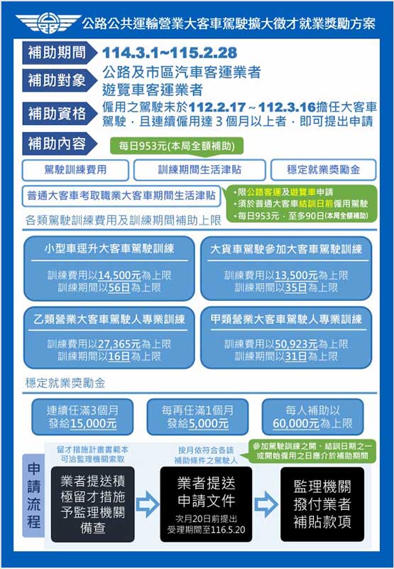 臺中區監理所所長楊聰賢表示,為改善營業大客車駕駛人缺員之情形,公路局自111年起辦理大客車駕駛徵才補助,為嘉惠更多客運業者申請補助,達到補足駕駛人力所需之缺口與培育及留用優良之駕駛人,已延長補助至115年2月28日。本次活動凡成功媒合者,連續受僱滿3個月,可請領穩定就業獎勵金、生活津貼及駕駛訓練費用等3種補助津貼,單一駕駛人最高可請領超過新臺幣20萬元。歡迎有意願投入大客車駕駛的朋友加入行列,不要錯過本次優渥補助機會!
