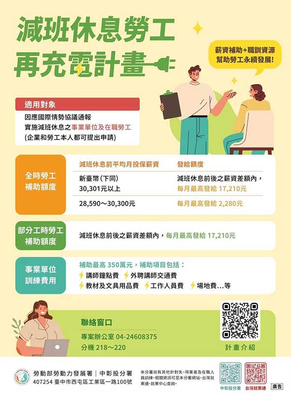 面對美國關稅政策等國際情勢的衝擊,製造業接單減緩,部分企業採取減班休息的方式作為因應。為協助產業穩定與勞工安心,勞動部除針對製造業9大行業推出「強化版僱用安定措施」外,更進一步推動「減班休息勞工再充電計畫」,不限產業別,凡受影響實施減班休息的企業或勞工均可提出申請。勞動力發展署中彰投分署鼓勵企業善用政府資源,讓「減班」成為蓄勢待發的中場休息,該計畫提供企業最高350萬元的訓練補助、勞工每月最高1萬7,210元的訓練津貼,助力勞工補能量、企業再起飛!