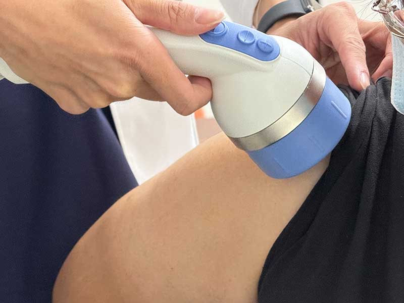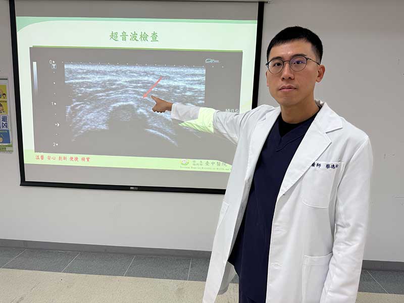 衛生福利部臺中醫院復健科蔡逸松醫師指出,患者就醫時原以為只是睡姿不良,到藥局買了止痛藥吃未改善,就醫接受x光與超音波檢查,才發現自己右肩四條旋轉肌中負責舉手功能的棘上肌鈣化,導致無法舉手,經消炎藥、熱療一個月效果未如預期,急著返回工作崗位的她嘗試用體外震波治療,幸運治療三周後大為改善,不但可以舉手還可以輕鬆操作剪刀設計髮型。