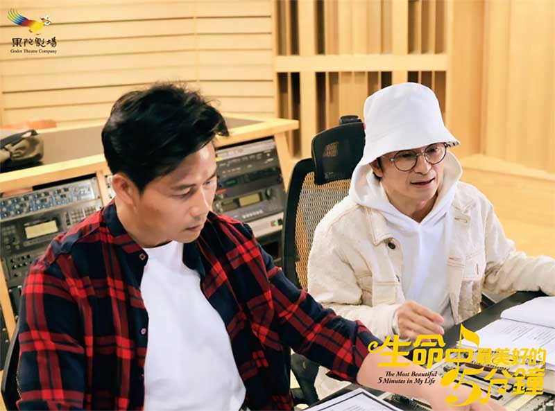 《生命中最美好的5分鐘》講述一名陰間使者誤殺了命不該絕的男人,只能允諾帶他穿越時空修補人生遺憾。然而當音樂響起,人生真的能重來嗎?由楊奇煜飾演的男主角穿梭時空,遇見了與自己相像的高中青年(鎮萬鈞 飾),錄音時,北藝大戲劇系出身、入圍第一屆臺北戲劇獎音樂劇類最佳男演員的表演新星鎮萬鈞,以清澈的聲音詮釋這位17歲少年,他分享:「一開始拿到劇本時,以為自己飾演的角色不受教、難相處,但讀本、排練到今天進錄音室,感覺好像離這個角色更近了一點。我跟小煜因為時空穿越而遇見,我把他視為親近的臭兄弟,所以在角色詮釋上可以有愛但又叛逆,清澈的聲音但有叛逆的表現,這些都是來自音樂的魔力。」小煜也透露再次錄製宣傳曲反而更自在:「錄音室就是一個人,不像舞台上要顧台詞、道具、對手,更能專注。」回想 2021 年排練曾因一段rap改了五個版本吃足苦頭,國華老師笑說:「當時真的很折磨,但這些年的歷練讓他更成熟,所以這次最早通過。」