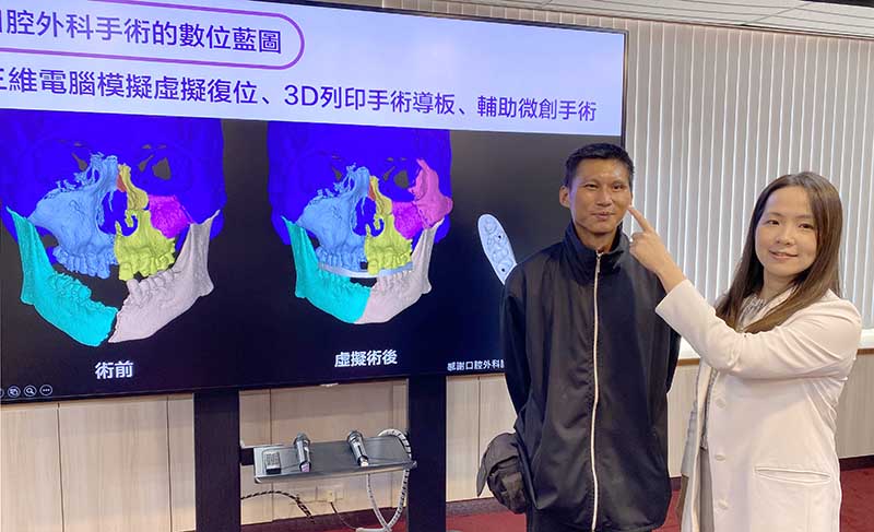 陳先生說,車禍時眼前一片空白,在地上翻滾後即失去意識。協助患者顏面重建的臺中榮總口腔顎面外科連凱華醫師指出,病患到院時傷勢嚴重,全臉部骨折,其中左眼球下方肌肉被骨折碎片卡住無法自由轉動,須緊急手術處理。口腔外科團隊在4小時內利用三維電腦模擬將碎裂的骨頭重新「拼好」並製作手術導引板,再由連醫師以經結膜和口內的微創手術,協助病人臉部、上顎與下巴等多處骨折復位固定,避免患者原本瘦長的臉型因骨折而變寬,讓咬合恢復密合。接續以未骨折的右側眼眶鏡像重建左側,根據三維列印模型預先塑形鈦金屬網板,解除左眼球肌肉卡陷狀況,重建眼眶底正常結構。