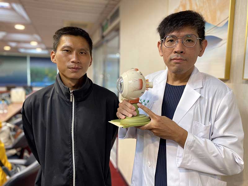 臺中榮總眼科部醫師阮國華(右)為陳先生進行眼外肌手術,改善他的複視症狀,重拾生活品