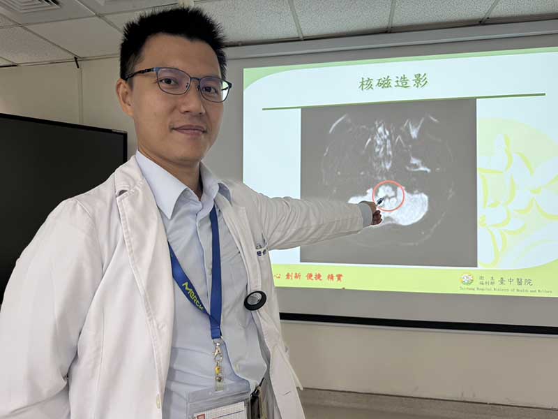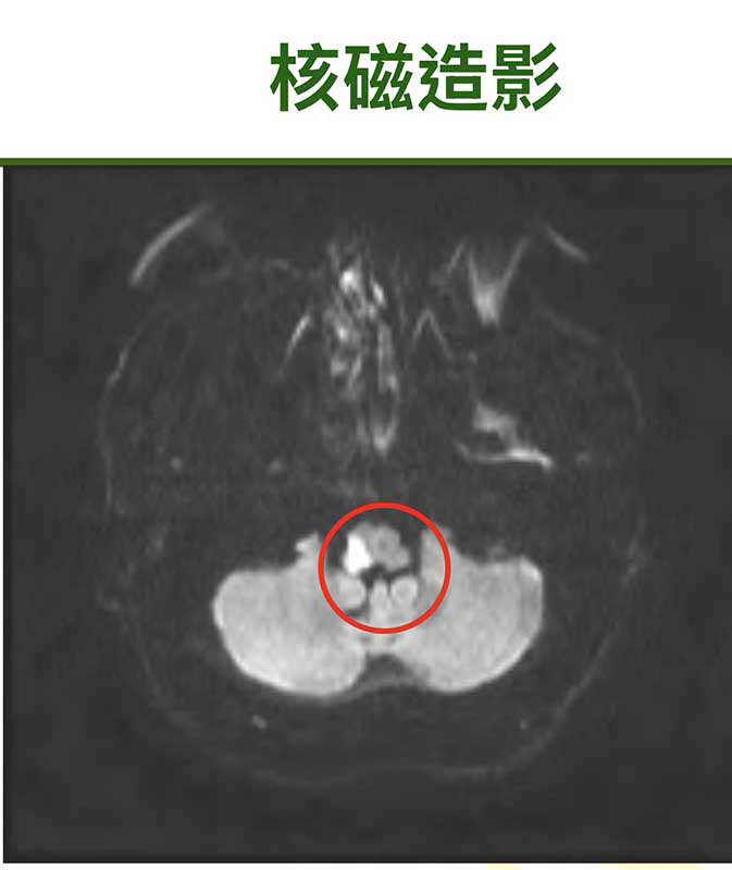 吳宇軒醫師說,患者到院時沒有臉歪嘴斜、半邊偏癱、講話口齒不清的典型腦中風症狀,但卻出現出現走路不穩等症狀,經神經理學檢查,並無手腳無力、言語不清與視力複視問題 ,但小腦神經功能測試卻發現右側辨識距離不良,懷疑小腦或腦幹中風,住院進一步進行核磁共振檢查,果然發現腦幹右側、延腦外側出現明顯梗塞。