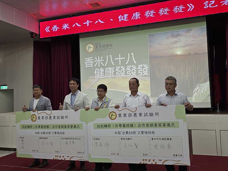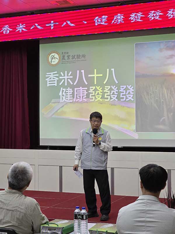 農試所表示,在氣候變遷加劇、生物多樣性快速流失及全球糧食安全風險日益嚴峻的今日, (2)日於該所大禮堂舉辦「香米八十八、健康發發發」發表會,介紹耐熱香米新品種`台農88號',並展示病蟲害智慧監測與友善防治資材,以及友善農產品加工加值成果。農試所表示,將以品種改良、智慧農業與永續加工三大主軸,協助農民提升抗風險能力,推動綠色稻作轉型。
