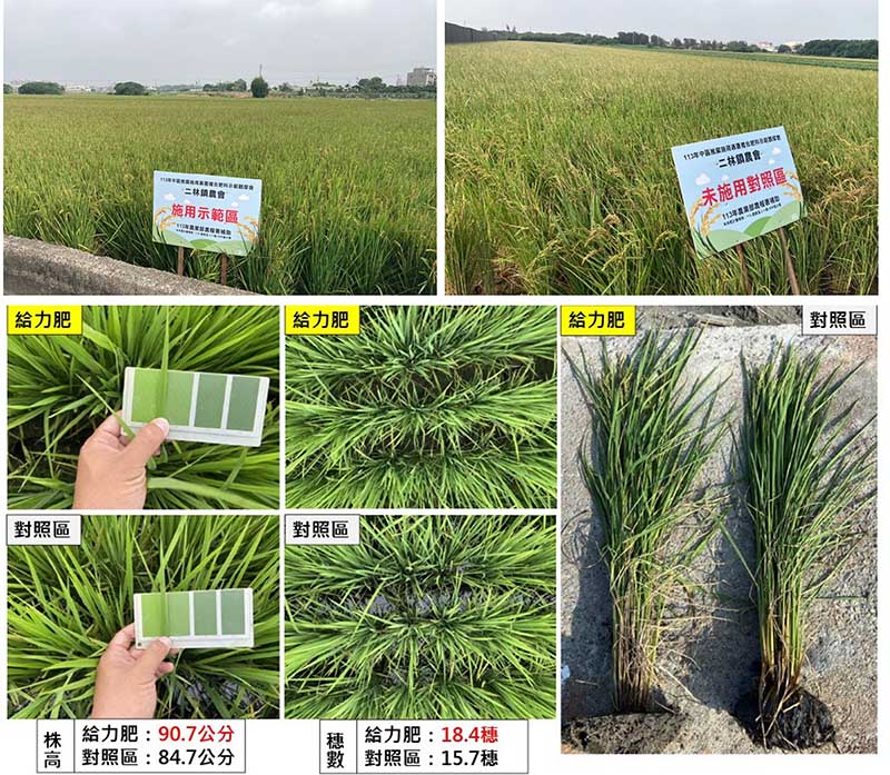 水稻施用裹覆複合肥料作為基肥打底施用,無須追肥,可至穗肥期再施肥,圖為113年彰化縣二林鎮二期水稻裹覆肥(給力肥1號)施用示範及對照田區試驗結果。