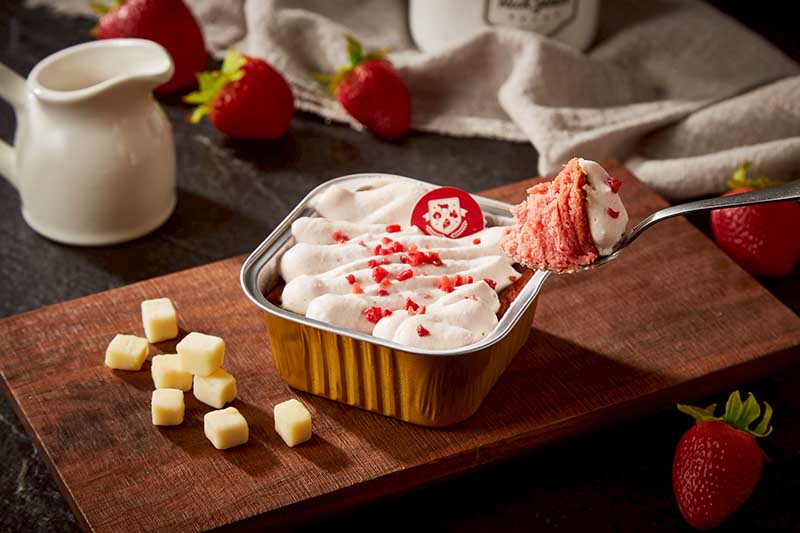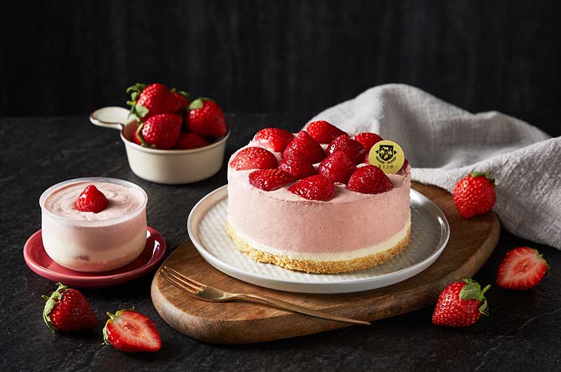 草莓控更不能錯過這款──草莓玻尿酸生乳酪蛋糕!嚴選初冬第一批新鮮草莓,果香濃郁、甜中帶酸,以自製雙層生乳酪(草莓生乳酪、優格生乳酪)及滿滿8顆新鮮草莓推疊出顏值巔峰,內餡還藏有草莓果粒及爽脆餅乾底,一口就能吃進三種層次!