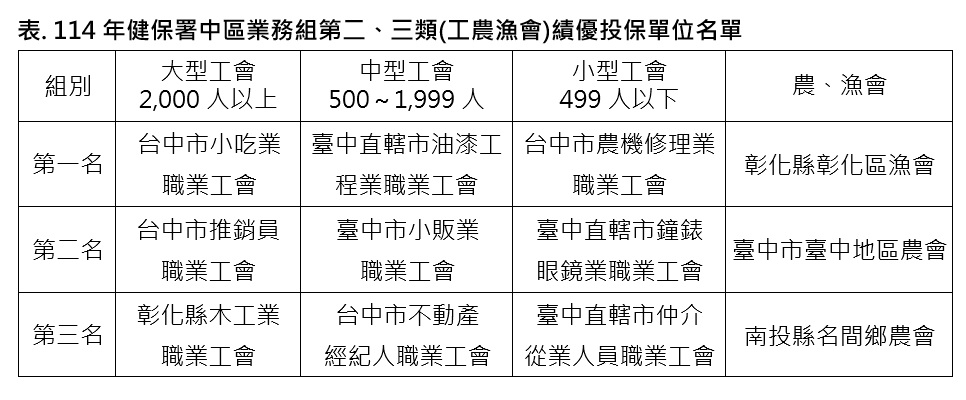 114年健保署中區業務組第二、三類(工農漁會)績優投保單位名單