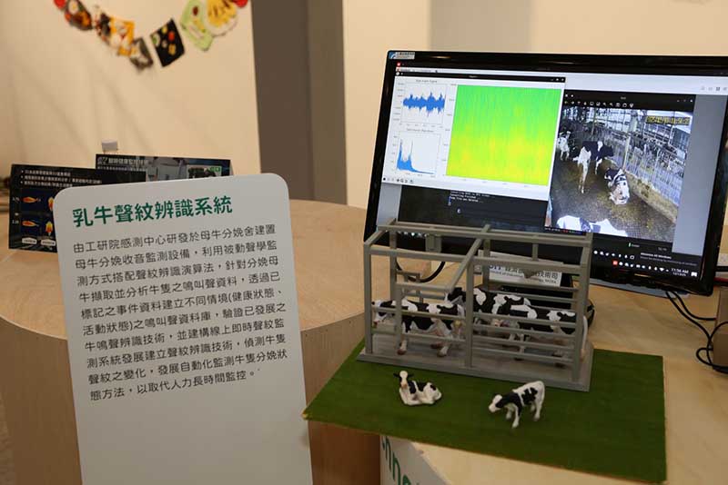 乳牛聲紋辨識技術:透過聲紋資料庫與 AI 演算法,可從牛隻叫聲判讀情緒狀態,協助牧場提升管理效率,已導入彰化元亨牧場、屏東和荃種牛場進行測試。