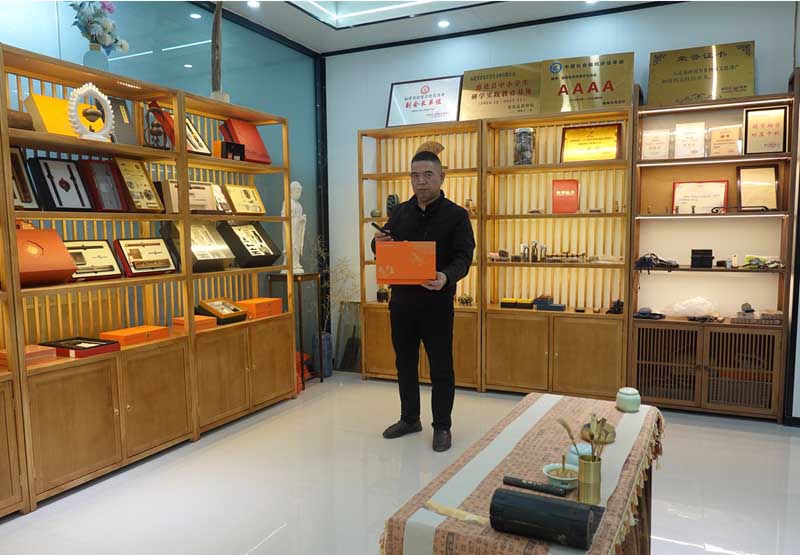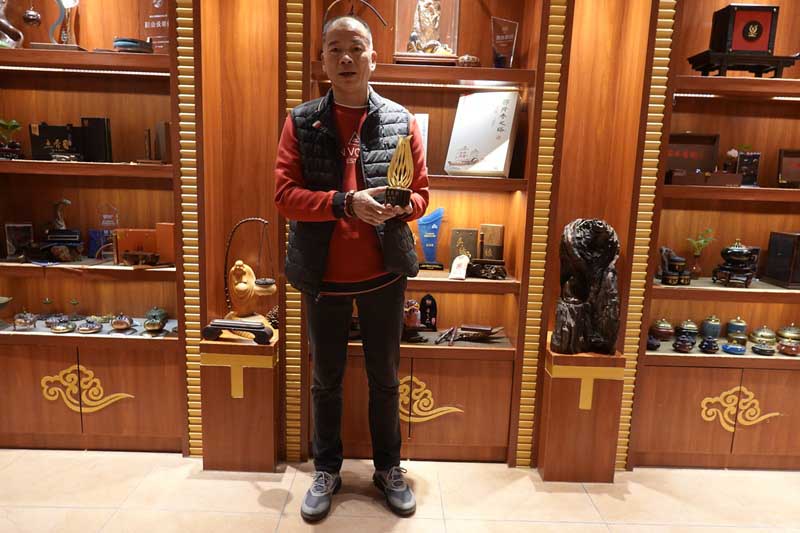 德化縣制香非遺傳承人、德發香業有限公司的執行董事兼總經理鄭世國展示產品。