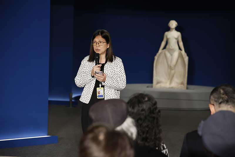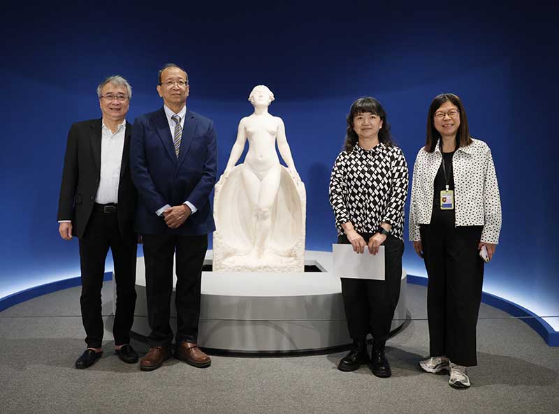 文化部次長 李靜慧(右2)、黃土水家屬代表 林麗純(右1)、國立臺灣美術館長 陳貺怡(左1)及保存者張鴻標家屬 張士文(左2)等人合影