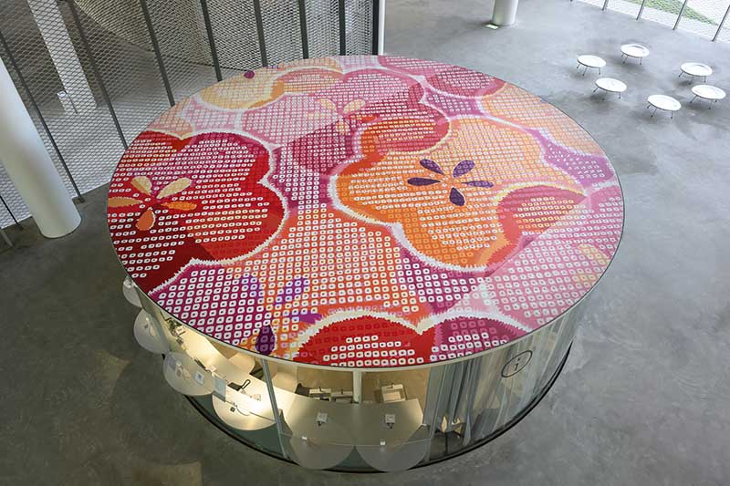 林明弘的《再製》(Processed)則以另一種姿態與建築結構巧妙交織。兩組手繪梅花圖樣佔據入口大廳的兩間玻璃屋屋頂:一組線條精確,另一組錯位重疊,透過如印刷過程中的重疊與錯置手法,將具有時代意義的「臺灣花布」圖騰賦予新意。當觀眾在連通美術館與圖書館的天橋上移動時,可以發現圖樣隨視角轉換而變化,構成一場關於感知、觀看與空間的詩意對話。林明弘認為觀眾的觀看也是作品的一部分,使藝術不再僅是被注視的對象,而是與建築、身體、光影共同生成的經驗。