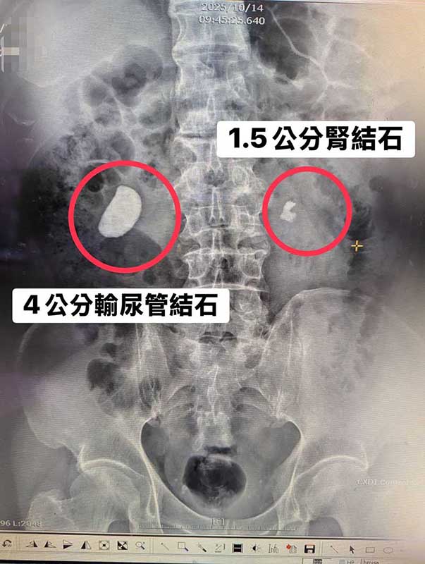 衛生福利部臺中醫院泌尿科簡維弘醫師指出,患者到院接受x光檢查,明顯可見右側輸尿管與腎臟交界處有顆4公分巨大結石,左腎也有顆1.5公分大結石,難怪造成兩側腎水腫、腰痛與血尿等結石典型症狀,為保護腎功能,院方立即安排右輸尿管取石手術與左腎體外震波手術,搶救腎臟功能。
