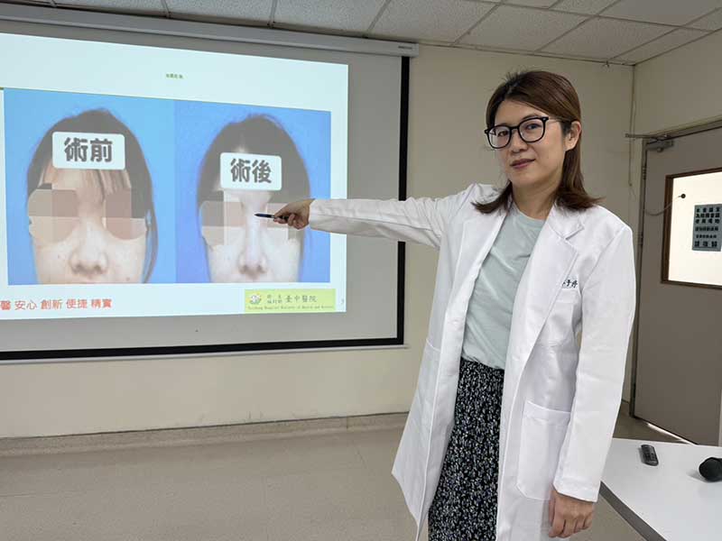 衛生福利部臺中醫院耳鼻喉科林于婷醫師說,患者外傷後到醫院時,右側鼻腔因鼻中膈軟骨被撞到彎曲阻礙呼吸道,外觀更是變成扁歪鼻,原本先接受鼻骨復位手術,但是無法恢復原本的堅挺鼻樑,經與患者討論評估,發現患者本身的耳軟骨太薄太軟不適合重建使用,最後決定取三公分自體肋軟骨重建鼻樑。