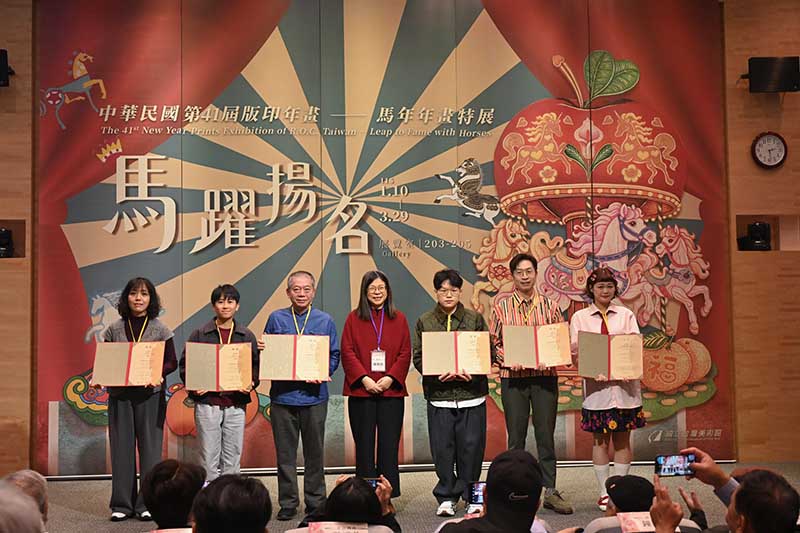 國立臺灣美術館即日起展出中華民國第41屆版印年畫「馬躍揚名–馬年年畫特展」,展出2件委託創作以及88件首獎、優選、佳作及入選作品。今(11)日辦理頒獎典禮暨開幕式,由國美館長陳貺怡主持,評審委員鐘有輝、賴振輝、張家瑀;委託創作藝術家林仁信、謝鴻均;以及所有得獎者等皆出席盛會。頒獎典禮由雲林縣斗南鎮新光社區發展協會創意布馬陣舞開場表演,熱鬧有趣,為活動增添吉祥、應景的氛圍,亦象徵未來一年名揚四海及順遂平安過好年。