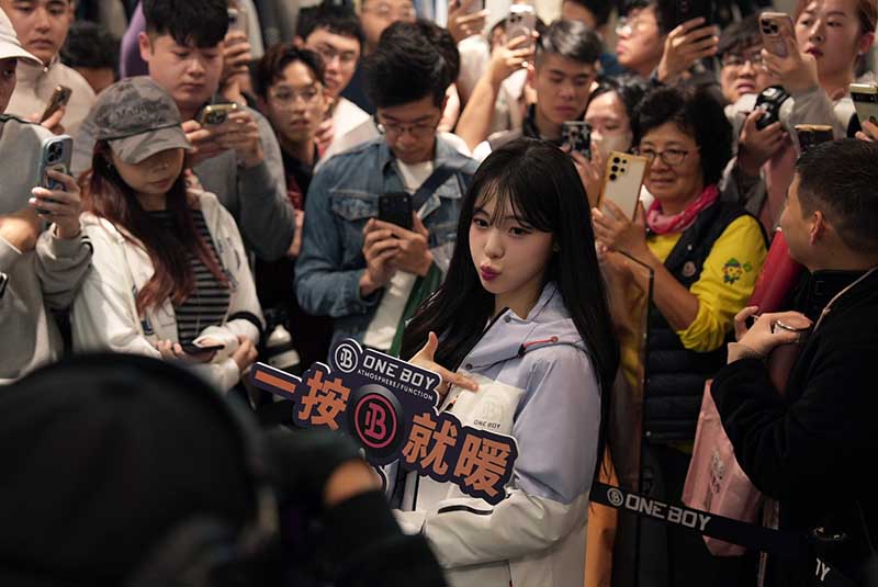 台中大遠百ONE BOY專櫃現場,一早就湧入大批粉絲排隊卡位等待人氣女神李多慧甜美現身,活動還沒開始,人潮已經擠滿櫃位周邊。隨著音樂響起、李多慧熱力登場,尖叫聲此起彼落,瞬間引爆全場氣氛。隨後她親自實測 ONE BOY 最新推出的「智能升溫七合一衝鋒衣 2.0」,現場直接操作四段式智慧溫控系統,讓外套「一按就熱」,溫度數字快速攀升,現場粉絲驚呼連連,多慧也笑說:「真的熱得很快!」讓活動氣氛再度升溫。