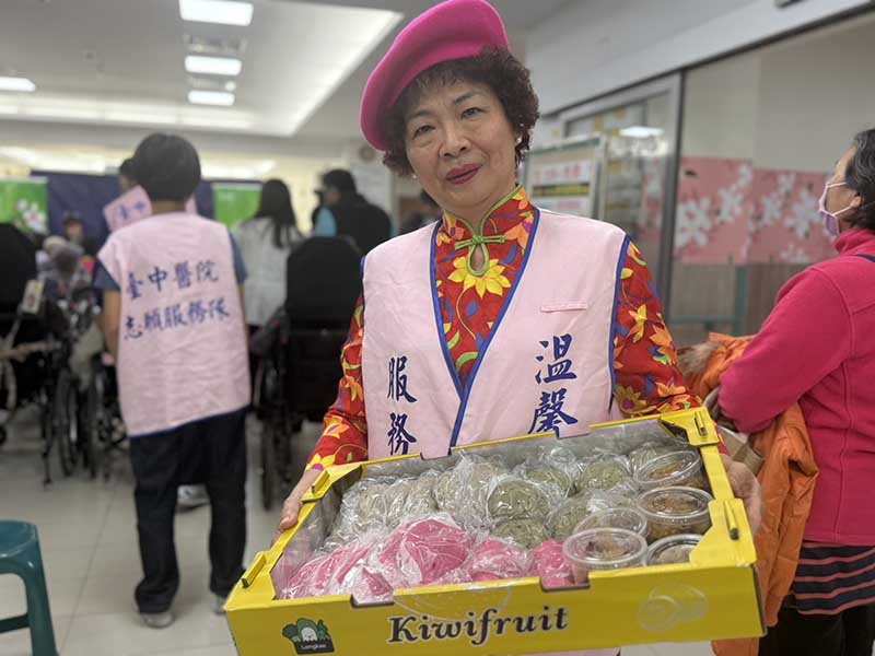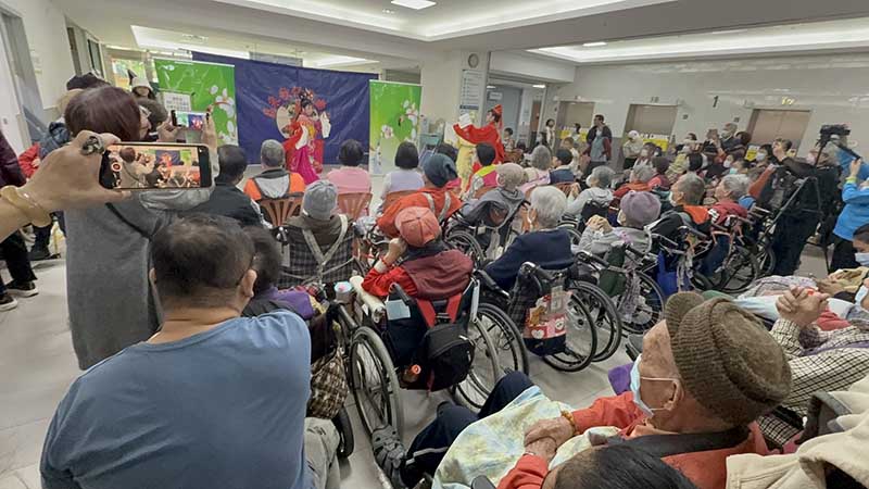 促成這場歌仔戲演出的臺中醫院志工隊長鄭靜吟說,因為她媽媽愛看歌仔戲而跟劇團結緣,希望透過歌仔戲熱鬧演出陪醫院護理之家長輩與家人提前感受過年的歡樂氣氛,她還特別帶了自製的紅龜粿、甜米糕、碗粿等小