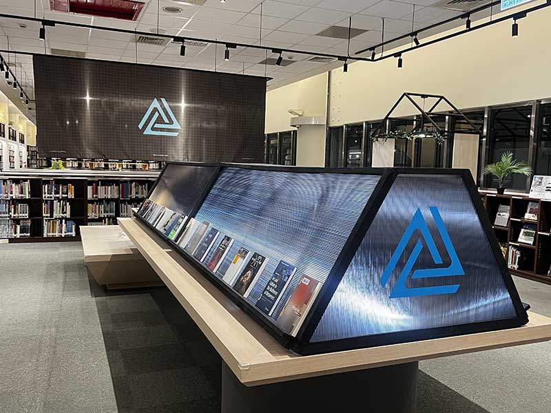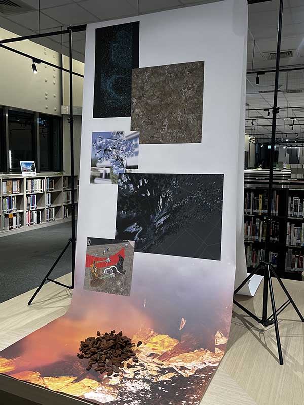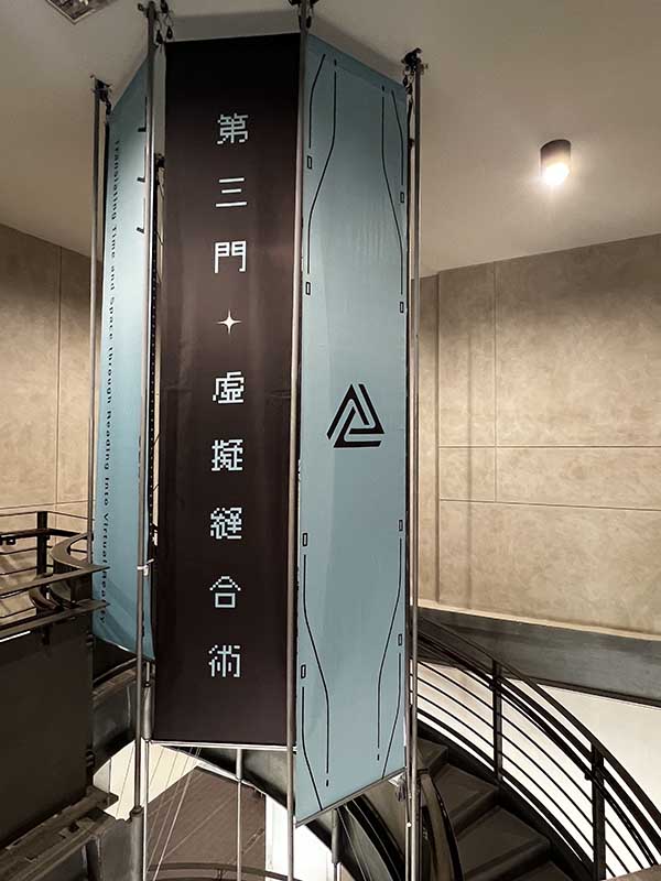 展覽現場透過多樣化的視覺輸出及觀展動線,引導觀眾從平面閱讀逐步走向沉浸體驗的轉譯實驗。展區共分為三大部分,首先是「策展心智圖」:位於策展區的大圖輸出,將複雜的轉譯邏輯轉化為視覺網絡,成為觀者進入展覽的導讀門檻 。其次是「時空轉譯論述」:展區分別以「空間的轉譯」與「時間的生成」為題 ,深入探討閱讀如何讓時間展開、讓空間折疊。最後是「沉浸式視覺引導」:從入口處高達 4 公尺的旋轉樓梯掛旗 ,到玻璃展櫃的幾何透貼與閱讀區懸掛裝置 ,觀眾將穿梭在由數位網格與藝術論述交織而成的物理空間中。