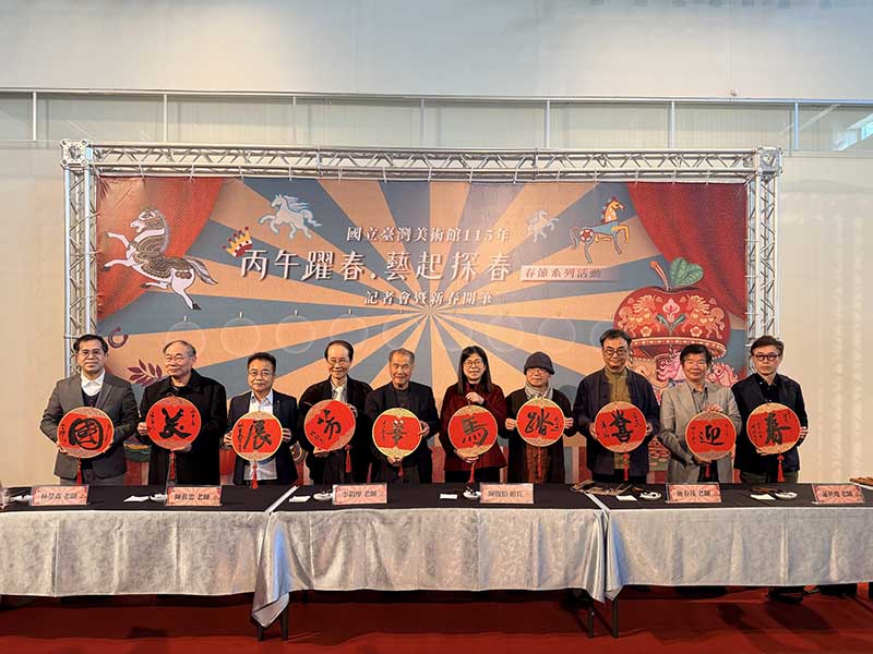 國美館今(24)日舉辦記者會暨新春開筆,由國美館長陳貺怡及李轂摩老師、施春茂老師、陳欽忠老師、林榮森老師、蕭世瓊老師、陳志聲老師、張志鴻老師、林俊臣老師、許志芳老師等9位知名書法家現場開筆祝福斗方,並現場揮毫祝賀春聯,傳遞馬年的期許祝福。當日並發送名家墨寶印製春聯,分別是國寶書畫家李轂摩老師、114年全國美術展書法類金牌獎許志芳老師之墨寶,供民眾限量索取。
