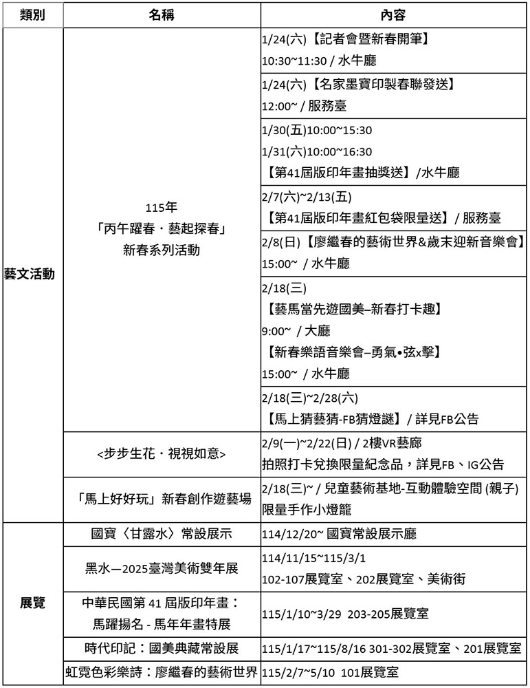 國美館自今(24)日起至元宵節,陸續推出「丙午躍春-藝起探春」春節系列活動,包含「新春開筆」、「名家墨寶印製春聯發送」、「版印年畫抽獎送活動」、「藝馬當先遊國美─新春打卡趣」、「新春樂語音樂會」、「FB猜燈謎」等,過年期間亦有「第41屆版印年畫:馬躍揚名–馬年年畫特展」、「虹霓色彩樂師:廖繼春的藝術世界」、國寶〈甘露水〉常設展示等重點展覽,邀請大家齊聚國美館,在藝術與歡樂中迎春賀歲。