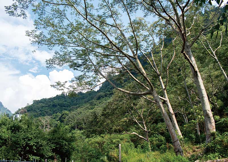 染料作物-山黃麻,樹皮會流出黃色的汁液,用竹筒蒐集,將布放進汁液中浸泡