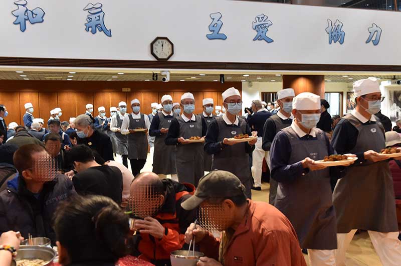 中午,大眾歡喜圍爐。慈濟志工與鄰近公所人員共同展現「上菜秀」。一盤盤美味佳餚都是慈濟志工精心設計菜單、提前多日備料。在熱鬧的圍爐氛圍中,香氣與笑聲交織成最溫暖的年味。志工們用心準備的不只是餐點,更是一份關懷與祝福,讓每位照顧戶在寒冬中感受家的溫度。