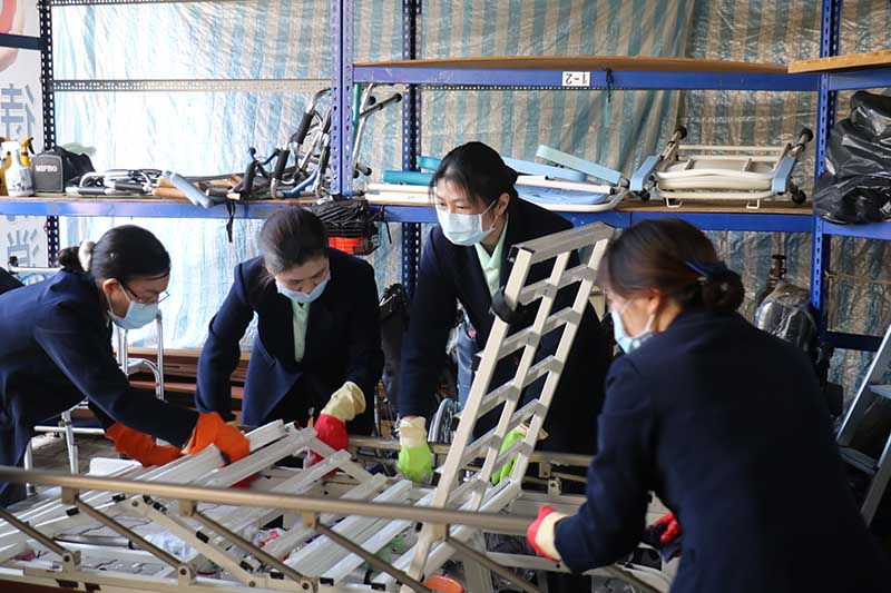 透過平台資深志工指導,醫院同仁分組進行輔具回收分類、細部拆解與深度清潔。在清消現場,醫護同仁彎腰仔細刷洗病床及輪椅的陳年污垢,不只是體力勞動,更是一堂「惜福」與「生命教育」的實作課。幾位跟隨父母前來的「小小志工」格外引人注目。隨行家長之一的長照A個管李佳霖分享,透過實際清洗,孩子能認識輪椅結構,未來若身邊親友或同學有需求,就能第一時間想到慈濟環保站有輪椅、拐杖、便盆椅等資源可以協助。從「做中學」獲得的同理心,比教科書的文字更深刻。現場志工也表示,透過體驗生活的不便,孩子能將感受延伸到對他人的關懷。
