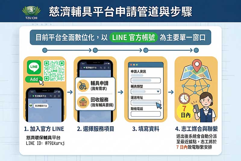 東大輔具平台自2023年10月成立以來,服務量能呈倍數成長,初期每月需求300件,至2025年底已突破每月600件。每件回收來的二手輔具,都必須經過嚴格標準化作業流程:日曬消毒、拆解清洗等等,最後貼上合格標籤,才能再次送給龐大的需求者。慈濟在全省都設有輔具據點(如花蓮本會、臺中東大園區、臺北雙和等),平台堅持「不租、不賣、完全免費」,但為了提升效率與統一調度,強烈建議有需求的人直接使用 LINE 平台申請。主要入口:慈濟環保輔具平台 LINE (ID: @791kurvj)。