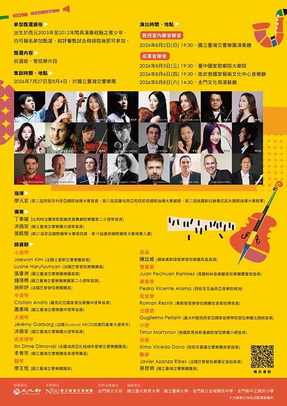 2026 NTSO國際青少年管弦樂營集結國內外首席級、教授級音樂家組成師資團隊,並邀請丁章媛、洪薇安、張凱閔三位青年音樂家擔任成果音樂會獨奏家。