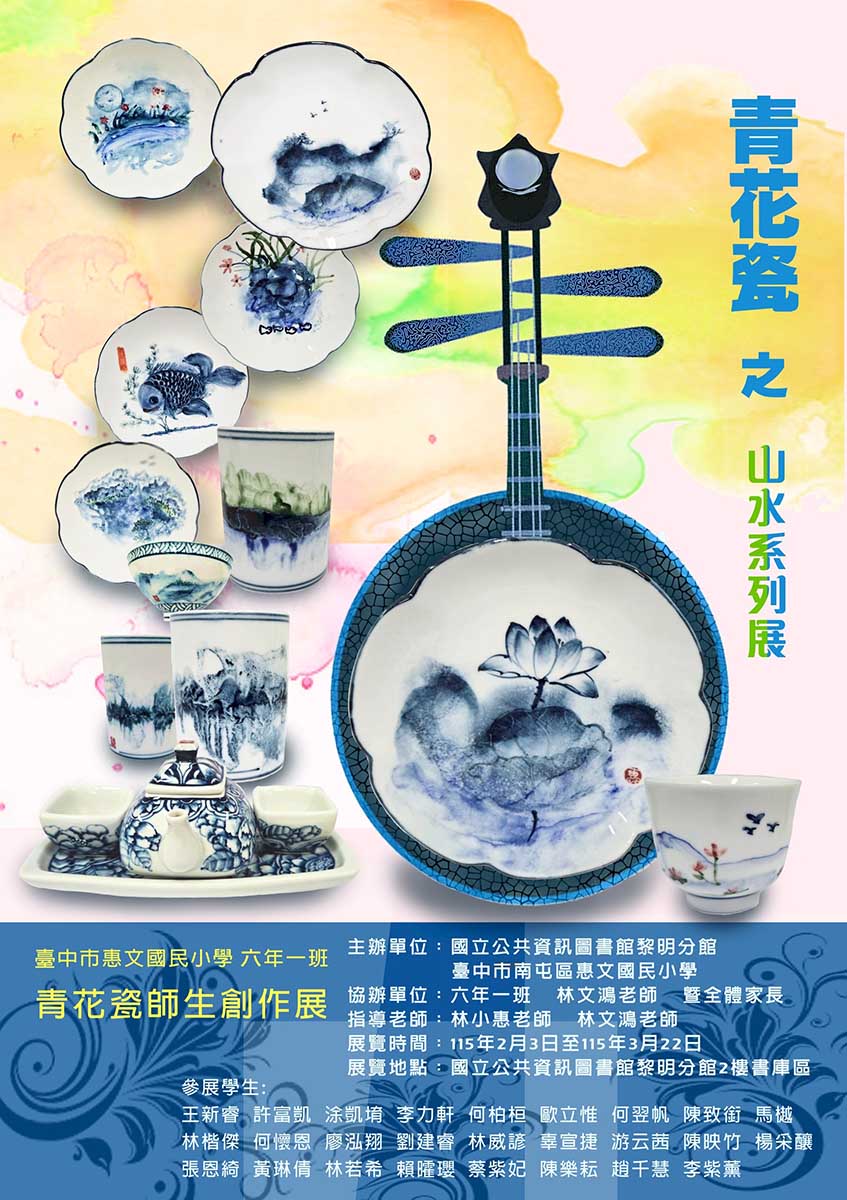 國立公共資訊圖書館攜手臺中市南屯區惠文國民小學,共同舉辦「青花瓷之山水系列師生創作展」,展期自115年2月3日至3月22日止,於國資圖黎明分館2樓書庫區展出,邀請民眾在圖書館閱讀空間中欣賞青花瓷藝術與水墨山水美學交融的創作成果。