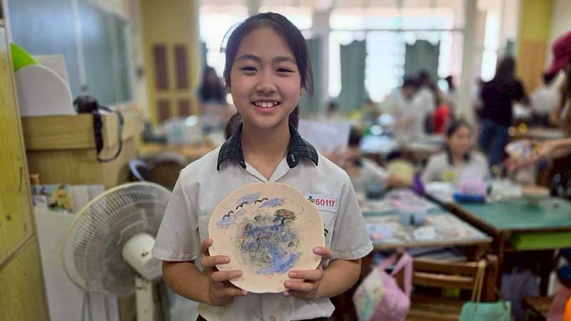 本次展出作品以陶瓷盤、杯等日常器物為創作載體,運用青花瓷技法進行構圖與描繪,呈現層次分明且富含詩意的山水與植物意象,線條流暢、釉色變化細膩,展現學生豐富的創作潛能與對自然環境的觀察體會。
