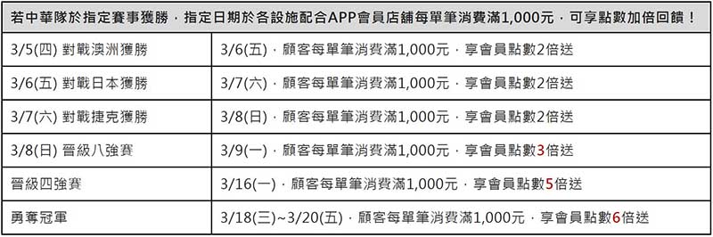 全力集氣中華隊勇奪勝利!若中華隊在指定賽事取得勝利,各設施將同步推出會員點數加倍送回饋,與全台球迷共享榮耀時刻!