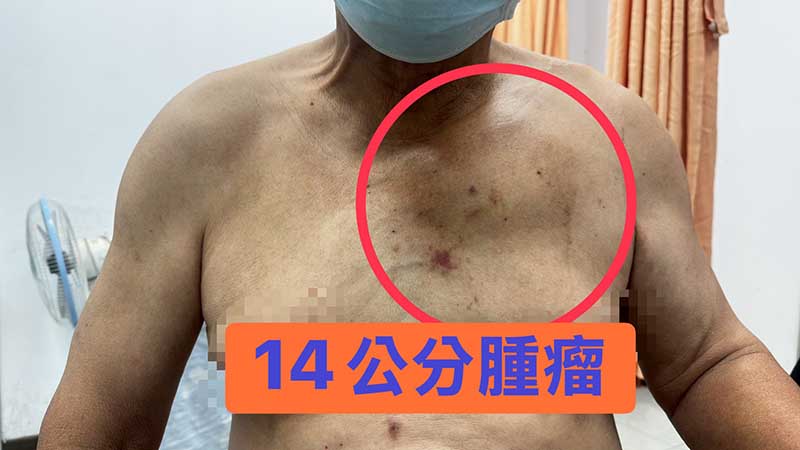一名70歲男性企業主,去年才抗攝護腺癌成功,春節前卻因呼吸喘、胸部出現腫塊就醫,醫師進一步檢查發現,患者罹患極惡性伯基特式淋巴癌,推論患者從出現症狀,短短三個月左右,左胸就迅速長出14公分腫瘤,腫瘤甚至推擠到胸肌肉眼可見。醫療團隊年前立即以標靶藥物治療,年後追蹤腫瘤已經幾乎消失不見,目前患者持續治療中。
