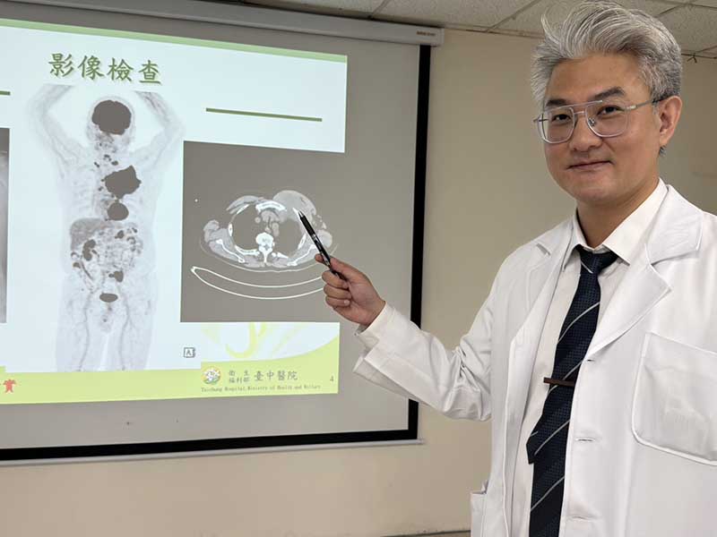 主播吳中純罹淋巴癌過世,藝人沈玉琳抗血癌成功將復出,讓民眾對癌症議題有更多的關切。衛生福利部臺中醫院腫瘤內科江佳駿醫師表示,患者因春節前工作繁忙,想要年後再治療,但本院癌症中心團隊、主治醫師江佳駿醫師發現該癌細胞相當兇猛,長大速度難以掌控,治療一刻不能等,不斷親自電話聯繫催促,終於讓患者年前同意接受化療,原本一個療程五次治療,患者年前才治療兩次,年後14公分腫瘤就幾乎消失,治療成效相吧當良好。