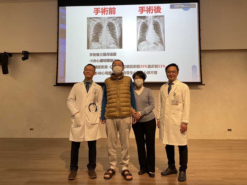 手術歷時8小時,依序完成冠狀動脈繞道手術、僧帽瓣修補、心室重建與冷凍去顫治療。術後隔天即順利移除呼吸器,再一天轉出加護病房,接受心臟復健後平安出院。術後一個月追蹤顯示,心臟收縮功能由原本32%提升至53%,瓣膜逆流消失,24小時心電圖亦未再出現心室性心律不整。陳先生恢復日常生活,並表示身體狀況比手術前更好;陳太太回憶從機上驚魂到返台治療的過程,對醫療團隊的專業與細心深表感謝與安心。