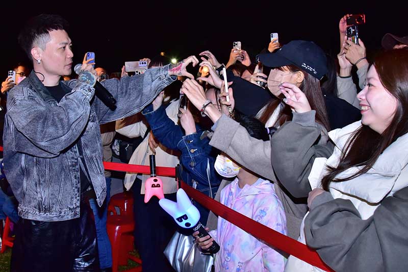 活動現場在燈光與音樂的交織下,營造出浪漫溫馨的春日氛圍,許多情侶、年輕朋友及家庭一同欣賞演出,隨著歌聲揮舞手中的夜光星星手燈,形成一片璀璨燈海,讓田心公園彷彿化身為一座青春樂園。