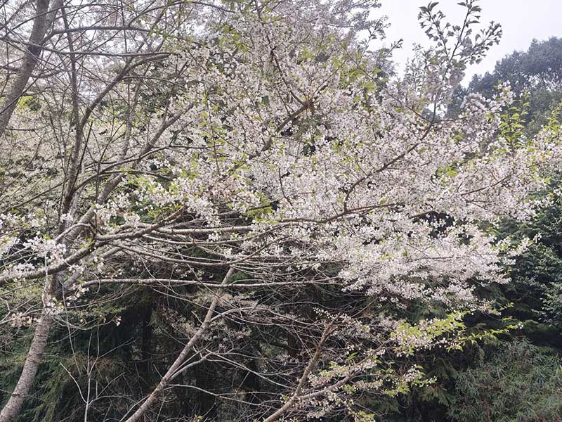霧社櫻為台灣特有種櫻花,花朵潔白細緻、外形小巧如鈴鐺,常在多數平地櫻花逐漸落幕後優雅登場,彷彿為山林披上一襲純白紗衣,彷若「三月雪」。近期園區內霧社櫻陸續綻放,當微風拂過,枝頭花朵輕輕搖曳,在藍天與森林的襯托下更顯清新雅致,為大雪山增添一份靜謐而浪漫的春日氛圍。