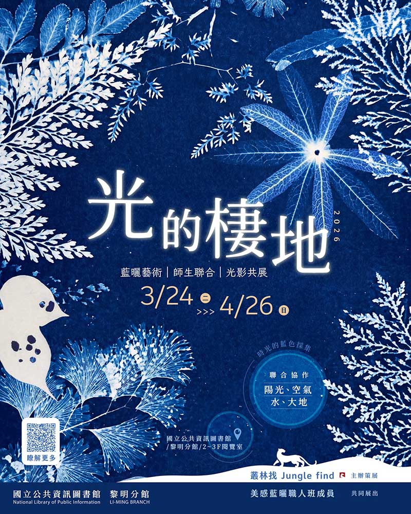 國立公共資訊圖書館(以下稱國資圖)黎明分館辦理「光的棲地:時光的藍色採集—叢林找藍曬主題創作展暨師生作品聯展」,展期自115年3月24日至4月26日止,於黎明分館2樓至3樓閱覽室牆面展區展出。展覽以傳統顯影工藝「藍曬(Cyanotype)」為核心創作媒材,透過陽光、水與植物的交互作用,呈現自然與時間留下的藍色印記,邀請讀者在閱讀之餘,走入光影交織的藝術空間。