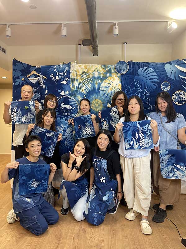 圖1:策展人許家瑋老師與學員於藍曬創作課程後合影,展現師生共同參與藍曬藝術創作之成果。