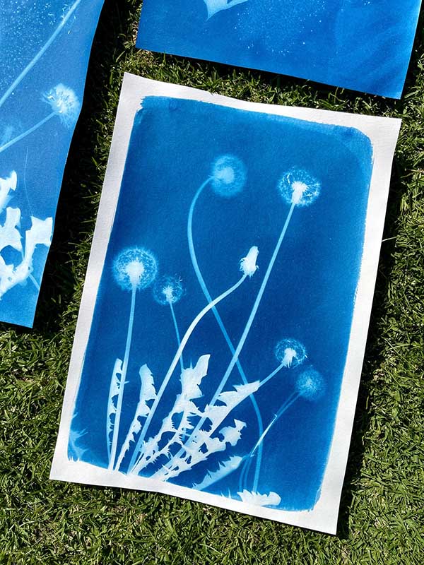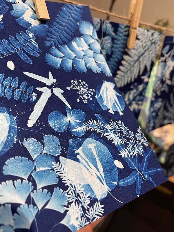 圖3:藍曬工藝透過陽光與水的作用,使植物輪廓在紙張上留下藍色印記,呈現自然顯影的獨特魅力。
