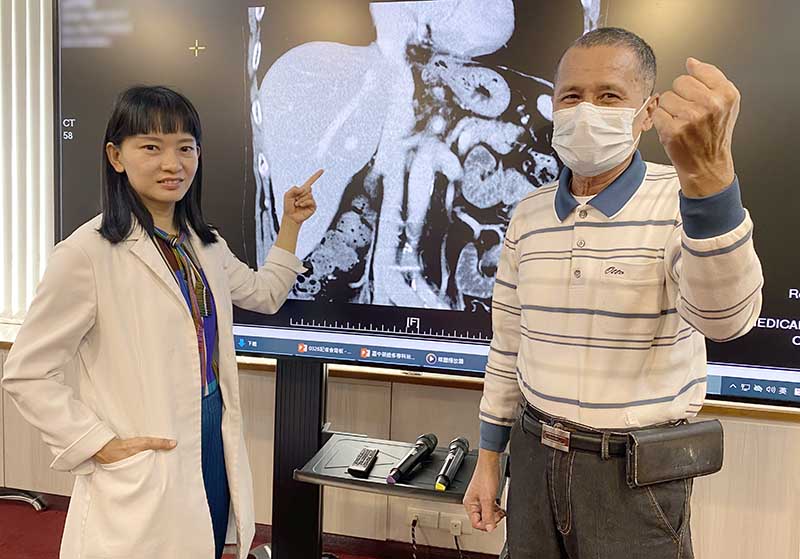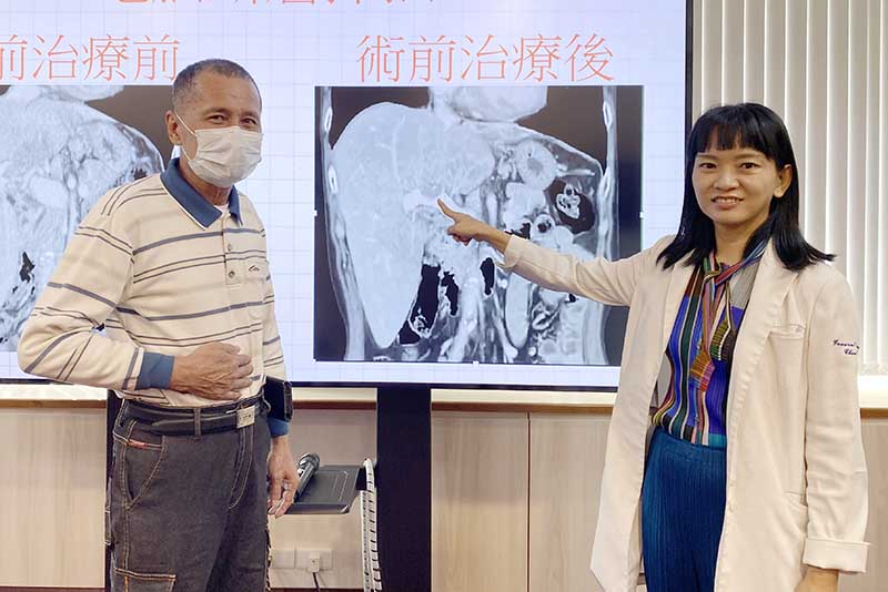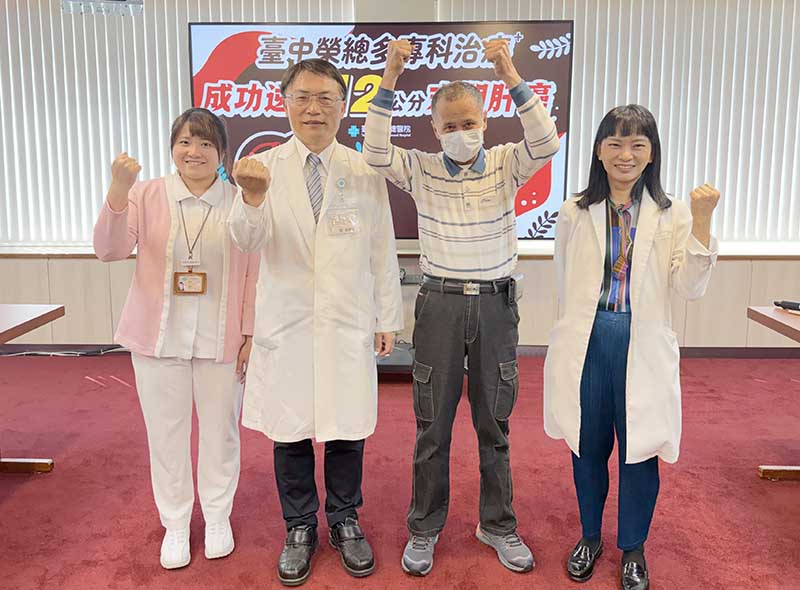 台中65歲黃先生去年因胃痛就醫,意外檢查出肝臟長了12公分巨大腫瘤,且已侵犯並堵塞2/3主門靜脈,被診斷為肝癌末期,被醫師告知「已無法治療」,建議安寧照護等同判死,但黃先生不放棄,轉至臺中榮總求生機。醫療團隊運用多專科合併治療策略,整合放射治療、免疫治療、標靶治療及術前腫瘤栓塞等方式,成功將腫瘤縮小1/3後手術切除,術後病理報告更顯示「找不到癌細胞」,成功治療末期肝癌。